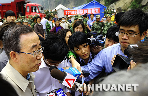 5月24日,聯合國秘書長潘基文來到中國地震重災區(qū)四川省汶川縣映秀鎮(zhèn)察看災情。這是潘基文在接受記者采訪。 新華社記者 任勇攝