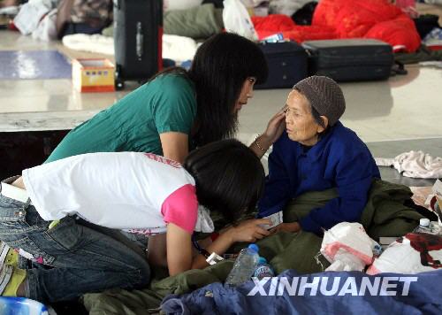 5月22日,兩位綿陽的志愿者在悉心照顧來自北川災(zāi)區(qū)的蔣桂芳老人。志愿者們?yōu)槔先讼茨槨⒉潦帧⑻投洹⒓糁讣祝瑹o微不至,親同祖孫。四川汶川大地震發(fā)生后,在綿陽市九洲體育館設(shè)立的受災(zāi)群眾接待安置中心,許多來自全國(guó)各地,不同職業(yè)、不同年齡的志愿者用細(xì)致周到的服務(wù)為受災(zāi)群眾排憂解難,并以自己的愛心和關(guān)懷撫慰受災(zāi)群眾,幫助他們渡過難關(guān),重建家園。新華社記者王建民攝