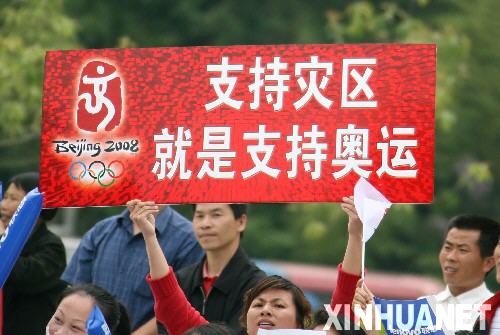 資料圖片:5月15日,當地群眾在觀看圣火傳遞時打出“支持災區就是支持奧運”的標語牌。當日,北京奧運會圣火傳遞活動在江西井岡山舉行。新華社記者李穎攝