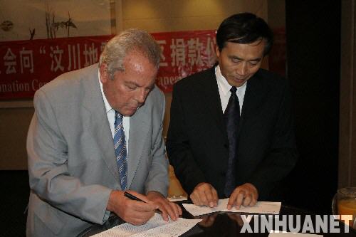 5月30日,在希臘雅典召開的中國(guó)船級(jí)社地中海委員會(huì)2008年年會(huì)上,希臘船東卡內(nèi)西斯(左)為地震災(zāi)區(qū)捐款。當(dāng)晚希臘船東為地震災(zāi)區(qū)捐款總數(shù)達(dá)到21.5萬美元。新華社記者梁業(yè)倩攝