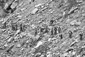 地面:6月4日,成都軍區某集團軍官兵冒著泥石流隨時可能發生的危險,繼續搜救失事直升機。孫繼煉攝