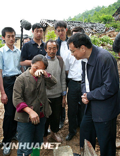 這是6月7日,李克強在陜西省寧強縣青木川鎮東壩村詢問受災群眾楊培翠生產生活情況。新華社記者 龐興雷 攝