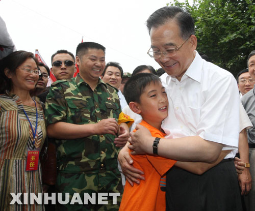 6月6日上午,專程赴四川綿陽考察唐家山堰塞湖搶險情況的中共中央政治局常委、國務院總理、國務院抗震救災總指揮部總指揮溫家寶,來到四川綿陽幾處群眾安置點看望轉移群眾。這是在綿陽美瑞紡織公司安置點,12歲的小學六年級學生王師晨說:“我還有一個小小的要求。請您擁抱一下我。”溫家寶立即伸出雙臂,將王師晨抱在懷里。新華社記者劉衛兵攝