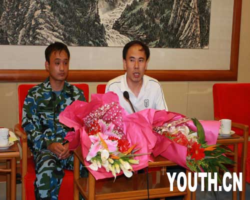 獲得榮譽稱號的唐山團市委書記劉金柱和“唐山十三義士”成員楊東是剛剛從抗震一線趕來報到。兩位英雄風塵仆仆,眼中布滿血絲,一臉疲憊。
