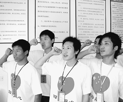 成都市新都區的災民安置點有900多名受災群眾,分別來自汶川、都江堰、彭州、北川等地,其中也有許多中小學生。他們剛進入安置點時,這里的秩序還比較亂。“其實很多事情是災區群眾可以自己做的,為什么不發動他們自助自救呢?”在團區委的支持下,5月19日,安置點插上了一面團旗,災區群眾臨時團支部正式成立,共有成員42人。臨時團支部的作用很快得到體現。食品發放次序井然,物資運送有條不紊,醫療服務、心理輔導、尋找親友等工作變得更加有序。