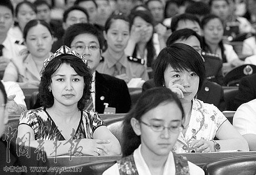 在團十六大開幕式上,6名少先隊員代表向大會獻詞。當一名來自四川地震災區什邡市的小朋友說完災區的情況,并表示有信心創造更美好的新生活時,代表們流下了感動的淚水。中國青年報記者李建泉攝