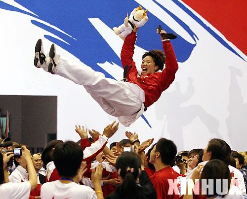 圖為2007年5月22日,陳中在北京舉行的2007年世界跆拳道錦標賽女子72公斤以上級決賽中奪冠,實現了“大滿貫”,隊友將她高高拋起。(資料照片)新華社記者羅曉光攝