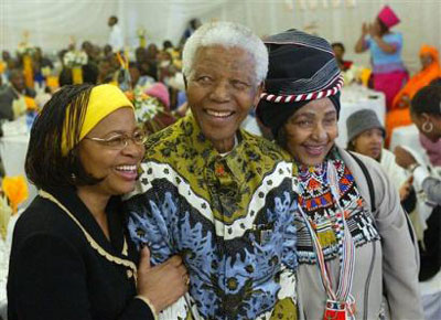 2004年7月18日,曼德拉與妻子格拉薩(左)和前妻溫妮(右)在86歲生日聚會上