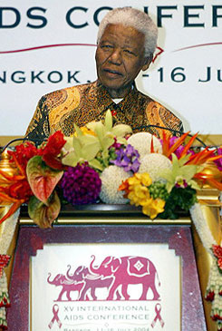 2004年7月16日,曼德拉在15屆國際艾滋病大會閉幕式上講話(法國媒體圖片)