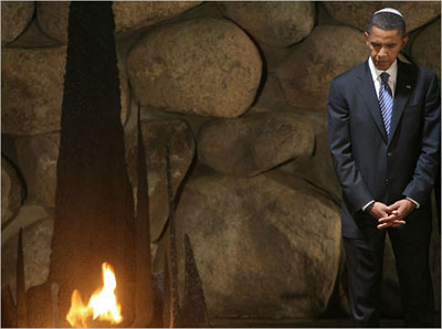 奧巴馬的每一站似乎都象征著什么:在以色列猶太大屠殺紀念館里默哀點火;參觀了正在重建的被哈馬斯火箭彈摧毀的民房;分別會見了以色列總理埃胡德·奧爾默特和巴勒斯坦民族權力機構主席阿巴斯,奧爾默特還對他說“上帝保佑你”。