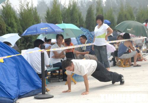 7月24日中午,在北京奧林匹克中心區奧運門票售票點,排隊等候購買奧運門票的市民自娛自樂打發時間。 新華社發