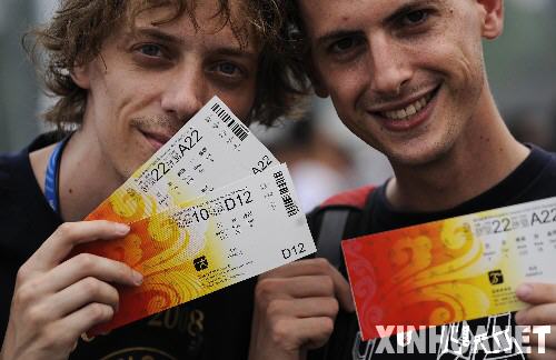 7月25日晚,兩名外國觀眾展示他們買到的北京奧運比賽門票。 新華社記者 郭磊攝