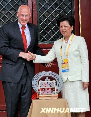 8月13日,全國人大常委會副委員長、北京奧組委副主席、北京奧運村村長陳至立和美國財政部長保爾森在頒獎儀式上。當日,美國財政部長保爾森來到北京奧運村,代表美國綠色建筑協會為北京奧運村頒發綠色環保金獎“能源與環境設計先鋒金獎”。新華社記者張國俊攝