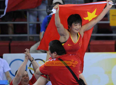 奪冠之后,王嬌顯得非常激動,她上前擁抱了站在場邊的教練;現場觀眾則顯得非常興奮!王嬌笑到了最后,這是中國摔跤隊在本屆奧運會贏得的首枚金牌,同時這也是中國代表團在北京奧運會奪取的第30枚金牌!王嬌賽后第一時間拿著五星紅旗繞場一周,中國農業大學體育館沸騰了!(來源:搜狐體育 編輯:歐葉)