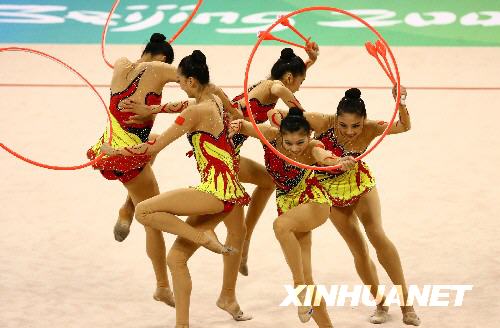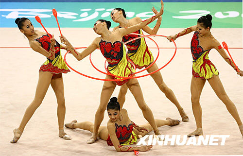 決賽首先進(jìn)行的是五繩操的比賽,衛(wèi)冕冠軍俄羅斯隊(duì)一套動(dòng)作完成的非常漂亮,得到了8.6的難度分,而其藝術(shù)分則為9.2的高分,最終俄羅斯得到了17.750的高分。預(yù)賽排名第一的白俄羅斯首套動(dòng)作也非常出色,在難度分和藝術(shù)分上都超過(guò)了俄羅斯隊(duì),但是由于完成中還不是很完美,最終這套動(dòng)作得到了17.625分,稍低于俄羅斯。中國(guó)隊(duì)在五繩操中同樣表現(xiàn)出色,一套難度8.9分、藝術(shù)分9.25,但是完成分稍低只有8.5分,最終中國(guó)隊(duì)得到了17.525分。
