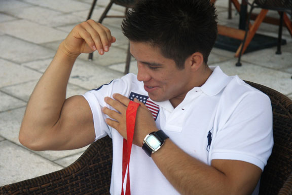也許是由于比賽的激烈與辛苦,年輕的賽胡多看上去要比同齡人稍顯成熟,比賽時留在眼角上的瘀傷被他脖子上掛著的金燦燦的獎牌映照得更加顯眼。