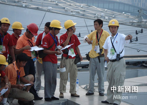 圖為工作人員在“鳥巢”進行閉幕式煙火最后的安裝調試。攝影:欣悅