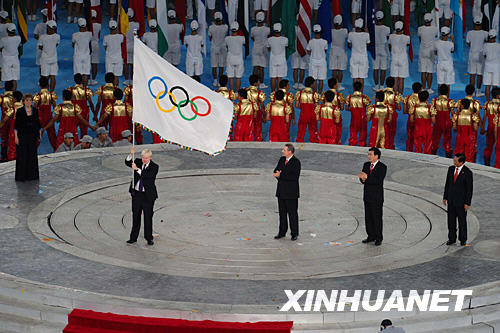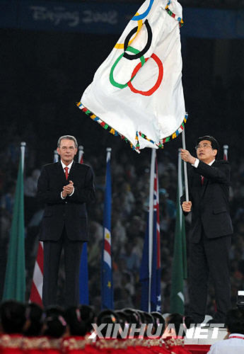 8月24日,第29屆夏季奧運會閉幕式在國家體育場舉行。這是北京市市長、北京奧組委執行主席郭金龍(右)在交接儀式上高舉奧林匹克會旗。新華社記者王雷攝