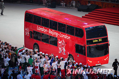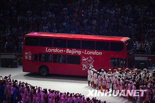8月24日晚,第29屆夏季奧林匹克運動會閉幕式在北京國家體育場——“鳥巢”舉行。這是倫敦巴士開進會場。新華社記者郭大岳攝