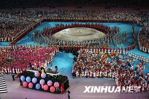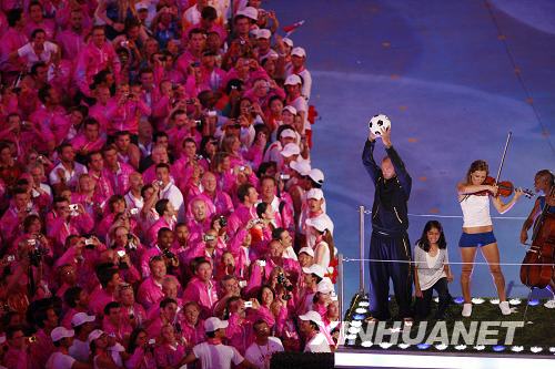 8月24日晚,第29屆夏季奧林匹克運動會閉幕式在北京國家體育場——“鳥巢”舉行。這是歌手在倫敦巴士上進行演唱,貝克漢姆在展示足球。新華社記者郭大岳攝