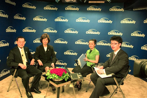 2008年8月25日,美國勞工部長趙小蘭接受中國日報網(wǎng)專訪。圖為趙小蘭(左二)及其父親趙錫成(左一)在直播間。