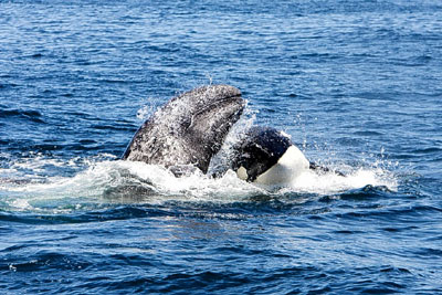 逆戟鯨俗稱殺人鯨,它們生性暴虐,為了填飽肚腹,不惜殘殺同類,連令人聞風(fēng)喪膽的大白鯊都是它們的獵物之一。圍攻灰鯨母子的殺人鯨每只身長近8米,重6噸,而可憐的小灰鯨只有6米長。3只殺人鯨輪番上陣,不斷地撞擊灰鯨母子,試圖將它們分開,經(jīng)過1個(gè)多小時(shí)的攻擊后,小灰鯨終于堅(jiān)持不住,被饑餓兇殘的殺人鯨分食。