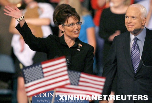8月29日,在美國俄亥俄州代頓市,美共和黨總統競選人麥凱恩(右)在競選集會上介紹他的競選伙伴、44歲的阿拉斯加州女州長莎拉·佩林(左)。