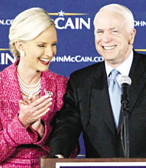 在麥凱恩通往白宮的道路上,不得不提到他的兩次婚姻,尤其是他的第二任妻子辛迪·麥凱恩。辛迪是亞利桑那州鳳凰城啤酒富商之女,她繼承了父親的股份,成為漢斯利啤酒經銷公司主席,身家超過1億美元。她雄厚的經濟實力不僅使麥凱恩得以過上有私人飛機和度假別墅的優裕生活,而且她廣泛的人脈也為丈夫的政治生涯提供了很大幫助,麥凱恩也因此被外界形容為“夫憑妻貴”。