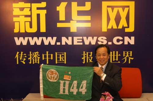 1984年,劉江永教授曾參加接待3000名日本青年訪華代表團。圖為劉江永教授向新華網網友展示當年日本訪華代表團的團旗。新華網蔡國華 攝