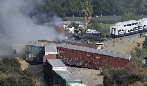 中國日報(bào)網(wǎng)環(huán)球在線消息:據(jù)美國《洛杉磯時(shí)報(bào)》等媒體9月13日報(bào)道,當(dāng)?shù)貢r(shí)間12日下午4時(shí)32分左右,美國洛杉磯一輛客運(yùn)火車在同一軌道上與貨運(yùn)火車相撞在一起,多節(jié)車廂因巨大的沖擊力被撞出軌道,造成大約15人死亡,135人受傷,其中很多人傷勢非常嚴(yán)重。
