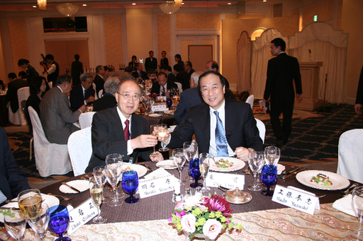 前聯合國副秘書長明石康與中國日報社總編輯朱靈舉杯相慶
