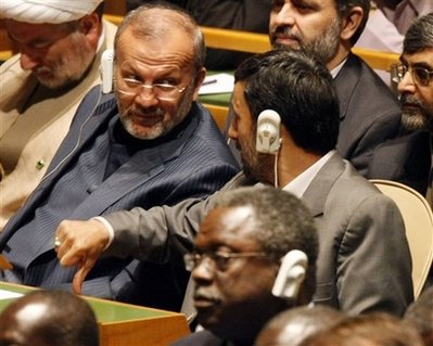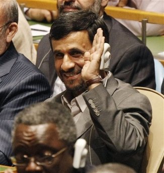 布什開講前,艾哈邁迪-內(nèi)賈德就擺出了興趣索然的表情。他一邊沖著會議廳里的人們招手,一邊咧嘴微笑。當(dāng)布什譴責(zé)伊朗時,他便轉(zhuǎn)過身來歪向旁邊一側(cè),攥起拳頭,做了一個大拇指沖下的動作。