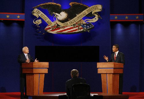中國日報網(wǎng)環(huán)球在線消息:當(dāng)?shù)貢r間9月26日晚,美國總統(tǒng)大選首場電視辯論在密西西比州牛津市舉行。民主黨候選人奧巴馬和共和黨候選人麥凱恩在90分鐘的辯論中就美國金融危機(jī)、伊拉克和阿富汗戰(zhàn)爭、伊朗核計劃、美俄關(guān)系、國家安全等問題闡述各自立場并激烈交鋒。辯論結(jié)束后,雙方陣營都在第一時間發(fā)表聲明稱自己的候選人表現(xiàn)更好,但輿論普遍認(rèn)為奧巴馬稍稍占優(yōu)。