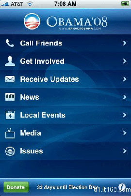 這款程序叫做“奧巴馬08”,幫助使用者與奧巴馬的其它投票者保持聯系,接收來自奧巴馬陣營的最新信息、視頻和照片資料,并告訴使用者如何在所在地區參與到大選當中。