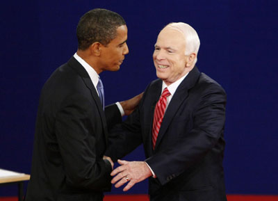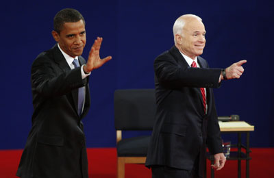 中國日報網環球在線消息:美國當地時間10月7日晚(北京時間10月8日早上),美國共和黨總統候選人麥凱恩和民主黨總統候選人奧巴馬在田納西州貝爾蒙特大學舉行辯論,這是兩人選舉議程三場辯論中的第二場。在這次辯論之前,蓋洛普民意測驗中心6日公布的民調結果顯示,奧巴馬的民意支持率為50%,麥凱恩為42%。奧巴馬已連續10天領先麥凱恩。