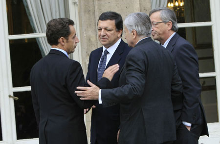 法國(guó)總統(tǒng)薩科齊(左一)與歐盟委員會(huì)主席巴羅佐(右二)、歐元集團(tuán)主席盧森堡首相容克(右一)和歐洲中央銀行行長(zhǎng)特里謝交談。