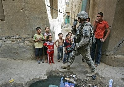 2008年10月6日,一名美軍士兵在巴格達巡邏,一群伊拉克孩子在旁邊觀看。(美國媒體圖片)