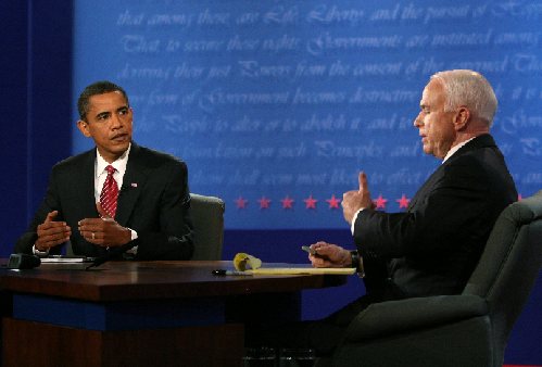 中國(guó)日?qǐng)?bào)網(wǎng)環(huán)球在線消息:北京時(shí)間10月16日早上9點(diǎn),美國(guó)共和黨總統(tǒng)候選人麥凱恩和民主黨候選人奧巴馬在位于紐約長(zhǎng)島的霍夫斯特拉大學(xué)舉行了第三場(chǎng)也是最后一場(chǎng)電視辯論。兩人在90分鐘的辯論中闡述自己在經(jīng)濟(jì)、能源等內(nèi)政方面的立場(chǎng),其間夾雜大量人身攻擊,現(xiàn)場(chǎng)火藥味十足。