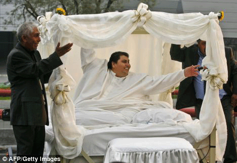 現年43歲的新郎烏里韋曾經是一名汽車配件經銷商,他2007年以590公斤的驚人體重被《吉尼斯世界紀錄》確認為“全世界最胖的男人”。盡管已經有6年不能下床,但烏里韋在過去的2年里一直在醫生的指導下堅持節食,并已經成功減掉大約230公斤的體重。現在,他又有了新的目標:爭取獲得“世界上減重最多的人”的頭銜。