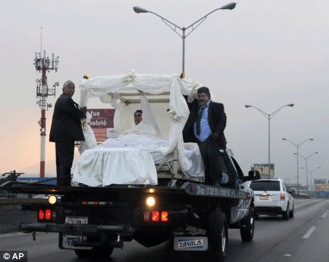 由于依然無法下地行走,烏里韋不得不依靠一輛貨運卡車連人帶床將他運到了婚禮儀式現場。只見那張為他量身定做的床搭起了一個帳篷,并用鮮花和鑲著金邊的蝴蝶結裝飾一新。路上,兩輛交警巡邏車專門為烏里韋開道,避開擁堵的交通。
