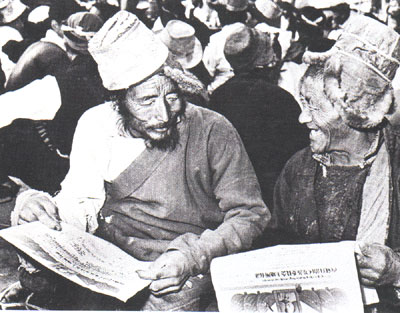 西藏自治區籌委會通過土地制度改革的決定,把原來農奴主的土地分給農奴們。圖為拉薩市東郊蔡公堂鄉的農奴分得了土地并領取了土地證。