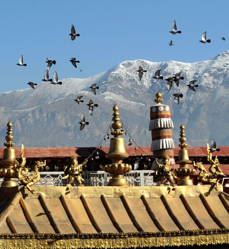 11月3日,鴿子在拉薩大昭寺金頂上空飛翔。