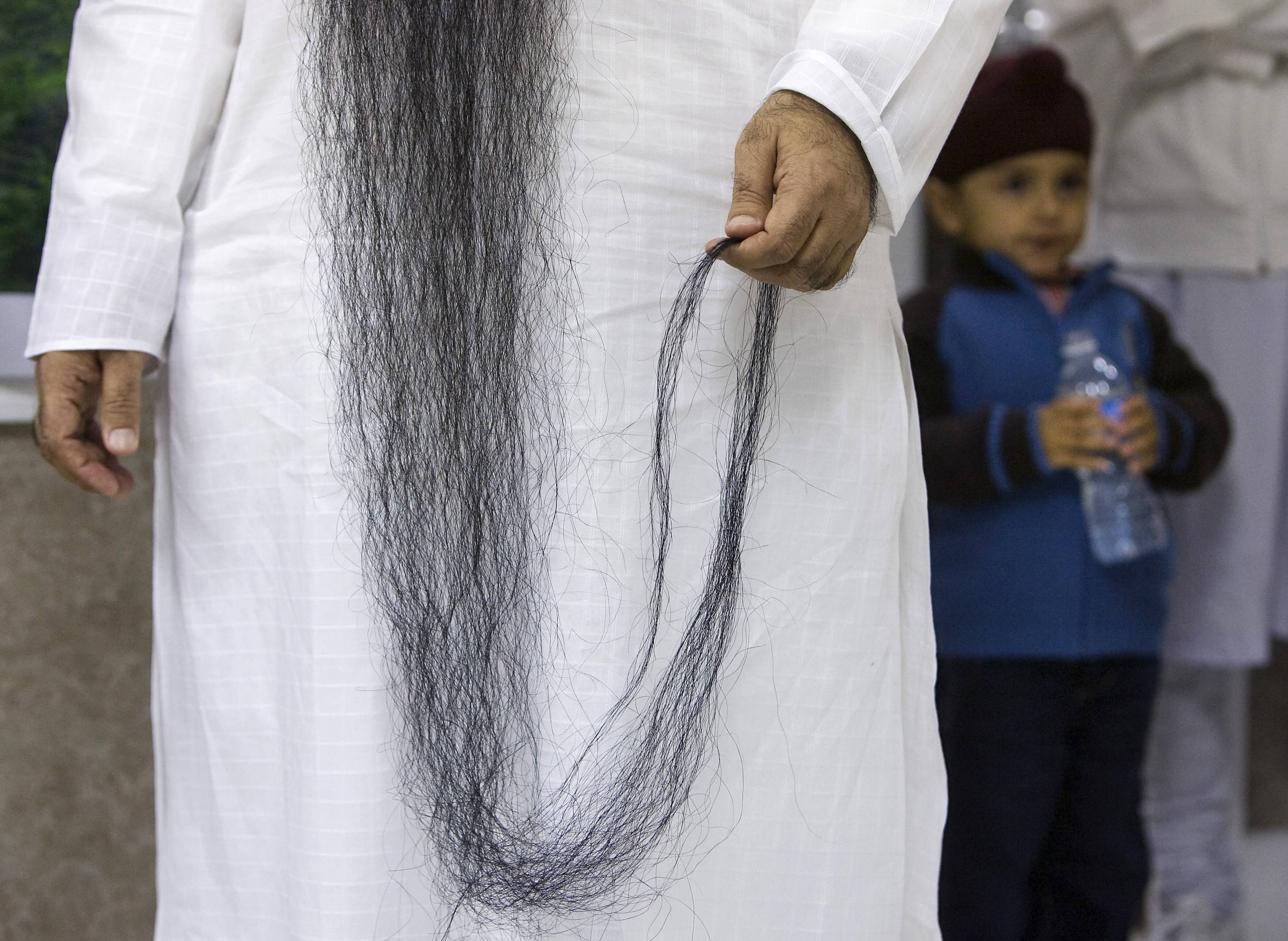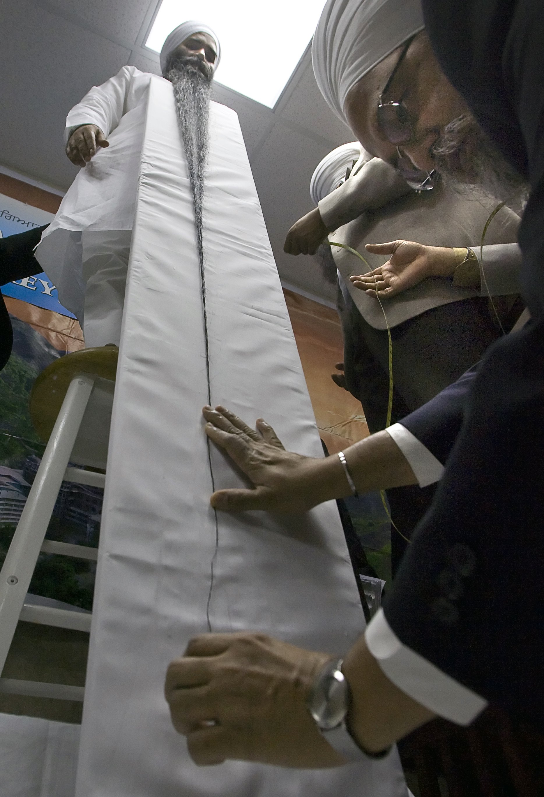 加拿大英屬哥倫比亞的一名教師薩瓦爾·辛格有望打破世界吉尼斯紀錄成為世界上胡子最長的人,他的胡子長度為1.895米。圖為11月11日,裁判準備測量他的胡子長度。 該項目的原紀錄保持者是印度男子沙姆謝爾·辛格,其胡子長度為1.83米。