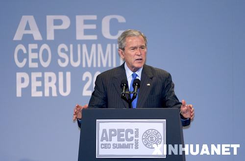 11月22日,在秘魯首都利馬,美國總統布什在亞太經合組織(APEC)工商領導人峰會上演講。當日,為期兩天的2008年亞太經合組織(APEC)工商領導人峰會在秘魯首都利馬開幕。會議圍繞世界經濟形勢和應對金融危機等議題進行討論,部分APEC成員領導人出席會議并發表演講。新華社記者張傳奇攝