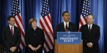 奧巴馬說,他新提名的經(jīng)濟(jì)團(tuán)隊(duì)人選在美國經(jīng)濟(jì)陷入危機(jī)的時(shí)刻提供了“可靠的判斷和不落俗套的主張”。
