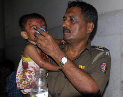 在孟買一家醫(yī)院,警察給受傷的兒童喝水。