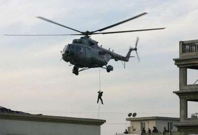 印度海軍陸戰(zhàn)隊隊員從直升機上空降到大樓樓頂。