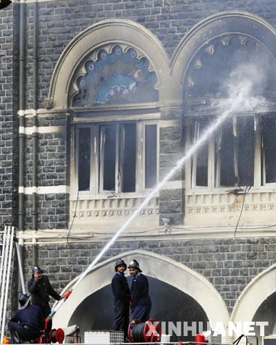 圖為 消防人員在孟買泰姬瑪哈酒店外滅火 2008年11月29日 印度軍方宣布在孟買泰姬瑪哈酒店的清剿行動已經結束 新華社王曄攝