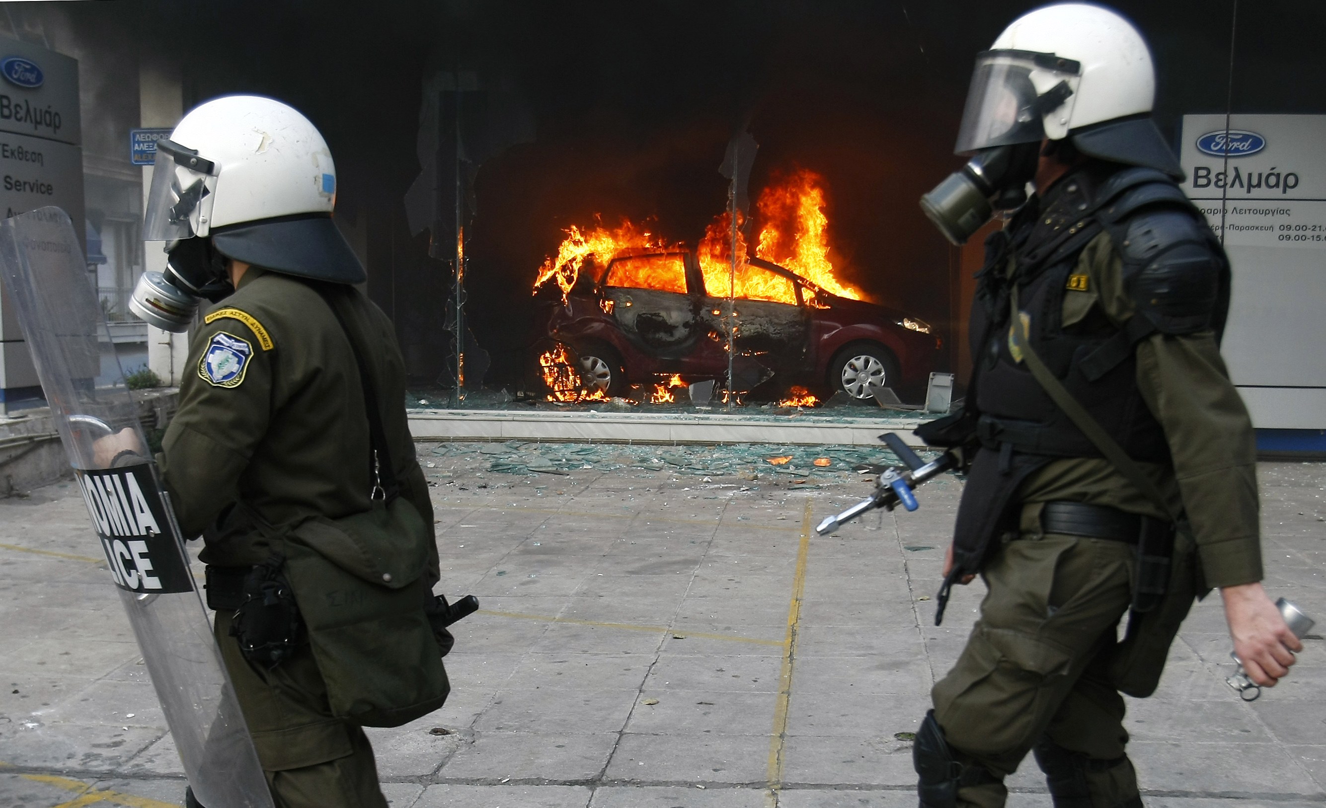 網友評論 條 2008-12-09 07:31:53 中國日報網環球在線消息:綜合外國媒體報道,希臘首都雅典和北部城市薩洛尼卡等地12月6日晚間至7日發生大規模騷亂,導火索是“一名雅典少年被警察射殺”。目前涉案警察已被拘留,希臘總理表示將嚴懲相關負責人。這次騷亂是希臘近年來最嚴重的一次。 ***少年被射殺引發騷亂 據警方介紹,當地時間6日晚,雅典埃克薩契亞區的一群年輕人向一輛警車投擲石塊,車內的一名警察隨即向人群開槍,打死了一名15歲的少年。事件發生后不久,這一地區數以百計的年輕人開始上街抗議。從7日開始,更多的示威者組成游行隊伍穿越雅典市中心,并與警察發生沖突。與此同時,包括薩洛尼卡在內的至少6座城市也開始爆發沖突。 圖為:防暴警察路過一輛正在燃燒的轎車 眾多青少年向警察投擲石塊、燃燒瓶,并放火燒毀市區內的汽車和商店、銀行等設施,警方則發射催淚彈驅散人群。這些抗議者還燒毀了一些臨街店鋪,并四處設置路障。7日下午,騷亂進一步升級。眾多蒙面少年走上雅典街頭,開始瘋狂地砸毀商店櫥窗和過往汽車。在一條前往警察總部的路上,數家銀行網點和一座大樓被人縱火焚燒。希臘議會附近道路上也發生了暴力抗議活動。整個雅典市中心一片混亂,狼藉不堪。 更多相關新聞