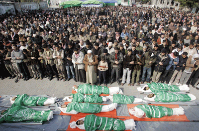 1月4日,加沙巴勒斯坦人在為當天空襲中喪生人默哀